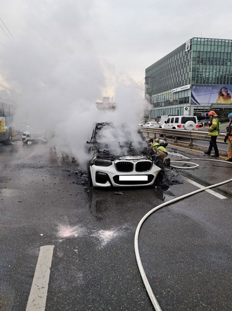 20일 경기도소방재난본부에 따르면 이날 오전 9시 38분께 성남시 분당구 궁내동 대왕판교로에서 BMW X3 가솔린 차량에서 원인 미상의 불이 났다.