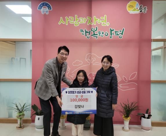 [와이뉴스] 양평군 용문면 다문초등학교를 재학중인 김빛나 학생이 19일 용문면사무소를 찾아 어려운 이웃들에게 전달해달라며 성금 10만원을 기부했다.
