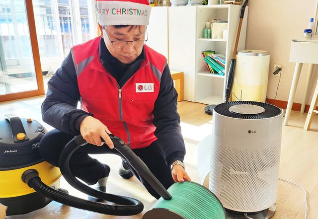 LG전자 서비스 매니저가 복지시설을 찾아 공기청정기 기능을 점검하고 필터를 청소하고 있다. ⓒ LG전자