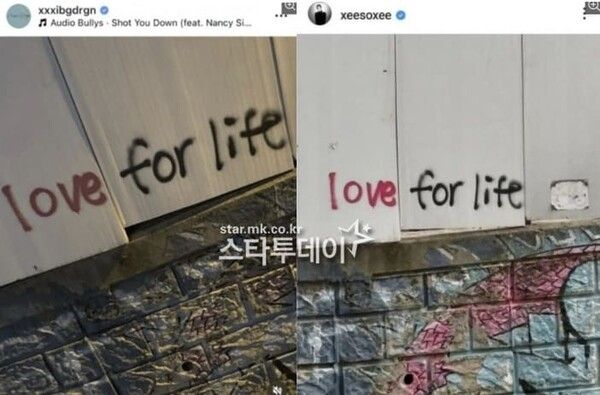 함께 공개한 사진에는 지드래곤과 한소희가 각자 자신의 SNS에 올린 게시물이 담겼다. 두 사람은 같은 곳에서 찍은 것으로 보이는 검은색 의자에 앉아 포즈를 취하는가 하면, ‘LOVE FOR LIFE’라는 글이 쓰여 있는 담벼락 사진을 나란히 올려 의혹의 불씨를 지폈다.
