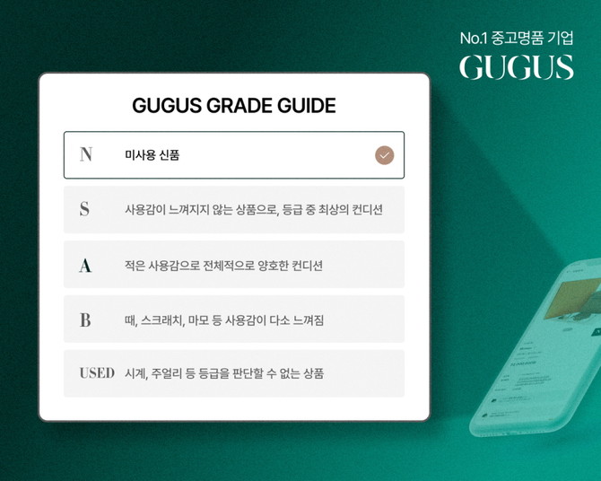 구구스는 업계 최대 규모인 60여명의 전문 감정사들과의 협의를 통해 등급 체계를 단순화했다. 기존 N-S, A+, A, B+, B, USED 6단계에서 N, S, A, B, USED 5단계로 개편하며 각 등급별 기준을 더욱 명확히 했다.