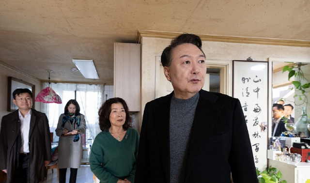 올해 1월 윤석열 대통령이 1기 신도시의 낡은 아파트를 방문해 주민의 고충을 듣고 있다. © 연합뉴스
