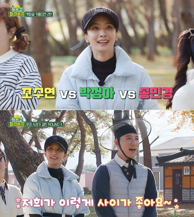 한편, 박정아는 4라운드 스피드 런 게임에 마지막 홀인 후 파트너와 취해야 하는 포즈로 ‘이마 뽀뽀’를 뽑아 이목을 집중시켰다. 고가의 프로필 촬영권을 두고 벌어진 대결에서 박정아는 열정적으로 샷을 쳤고, 마지막에 송민경에게 이마 뽀뽀를 해 화룡점정을 찍었다.