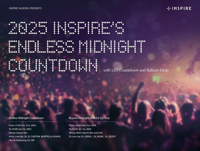 모히건 인스파이어 엔터테인먼트 리조트(인스파이어)가 연말연시를 맞아 새해맞이 카운트다운 행사 '엔드리스 미드나잇 카운트다운(Endless Midnight Countdown)’을 개최한다. 이번 행사는 12월 31일 밤부터 1월 1일 새벽까지 진행되며, 초대형 LED 스크린 카운트다운, 대규모 벌룬드롭, DJ 공연 및 애프터파티 등 연말을 기념하는 다채로운 프로그램으로 운영된다. 행사는 인스파이어 리조트 투숙객뿐 아니라 일반 방문객 모두 참여 가능하며 , 환상적인 오로라의 미디어 아트 쇼뿐 아니라 홀리데이 시즌 칵테일을 즐길 수 있는 오로라 바, 그리고 현장에서 펼쳐질 다양한 공연들이 준비되어 있다. 특히 1월 1일 자정에는 150m 길이의 오로라 거리를 채우는 기념 영상이 상영된다. 행사의 하이라이트로는 '애프터 미드나잇 DJ 파티 (After Midnight DJ Party)'가 있으며, 새벽 3시까지 축제의 열기를 이어간다. 한 해의 마지막 순간을 눈부시게 마무리하고 새로운 희망이 가득한 새해 첫 추억을 선사할 예정이다.