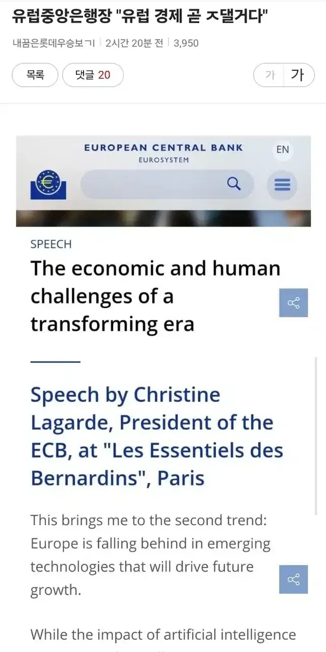 유럽중앙은행장.. 유럽 경제 곧 ㅈ될거다,,