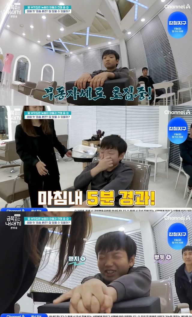 화를 멈추지 못하던 금쪽이는 생애 첫 '멈춤 훈련'에 도전했다. 미용실 의자에 앉으며 헤어롤을 말은 채 5분을 참아야 하는 것. 부부는 긴장된 채로 금쪽이를 지켜봤고, 5분 동안 금쪽이는 양손을 가지런히 모은 채 부동자세로 강한 의지를 보였다.
