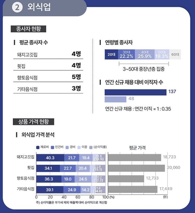 외식업은 87개소를 대상으로 가격과 가격 구성 비율을 조사했다. 1인 기준 평균 가격은 횟집 2만60원, 돼지고깃집 1만8723원, 기타음식점 1만7449원, 향토음식점 1만2733원 순으로 나타났다. 돼지고깃집의 가격 구성 비율은 재료비가 40.3%로 가장 높았고 이어 인건비 21.7%, 경비 19.4%로 필수 비용이 전체 가격의 80% 이상을 차지했다. 이윤은 18.6%, 부가세를 제외한 순이익률은 10.5%로 산출됐다.