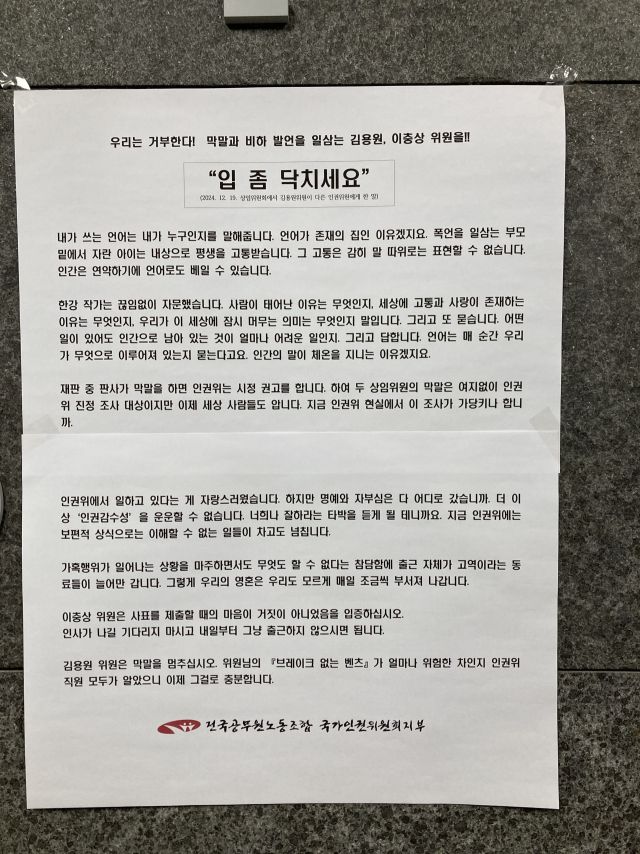 인권위지부는 "내가 쓰는 언어는 내가 누구인지 말해준다"며 "폭언을 일삼는 부모 밑에서 자란 아이는 내상으로 평생을 고통받는다. 그 고통은 감히 말 따위로는 표현할 수 없다. 인간은 연약하기에 언어로도 베일 수 있다"고 했다. 이어 "재판 중 판사가 막말을 하면 인권위는 시정 권고를 한다"며 "(김용원·이충상) 두 상임위원의 막말은 여지없이 인권위 진정 조사 대상"이라고 비판했다.