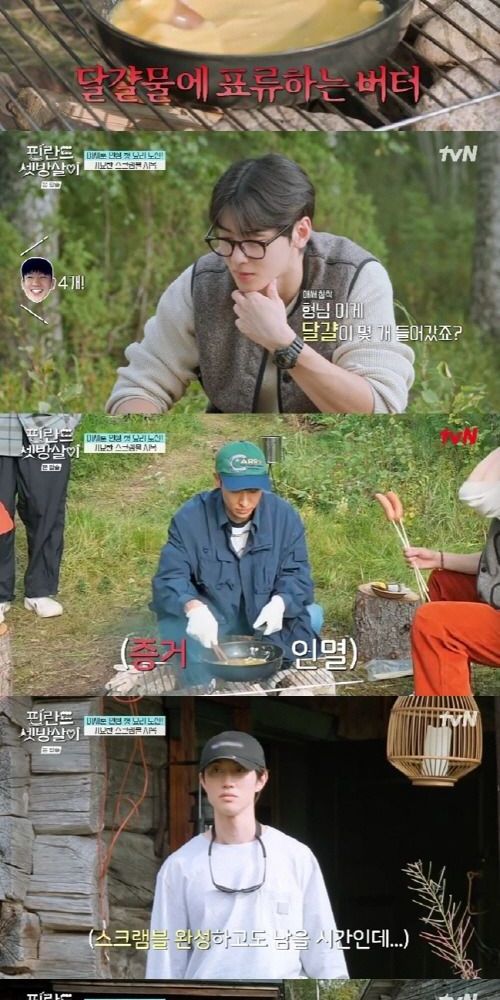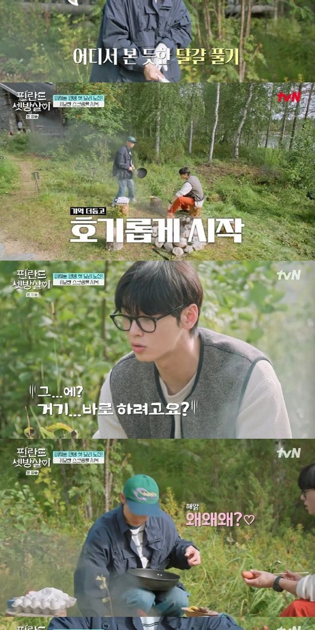 이제훈은 차디찬 팬에 달걀을 투하하고 미소를 지었다. 차은우는 "바로 하려고요? 그릇에 풀고 안 하고?"라며 당황했다.