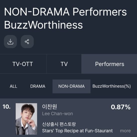 펀덱스는 최근 이찬원이 12월 2주 차 K-콘텐츠 출연자 화제성 비드라마 부문에서 KBS 2TV '신상출시 편스토랑'으로 전체 10위를 차지했다고 밝혔다. 그는 12월 1주에도 같은 부문에서 전체 5위를 차지한 바 있다.