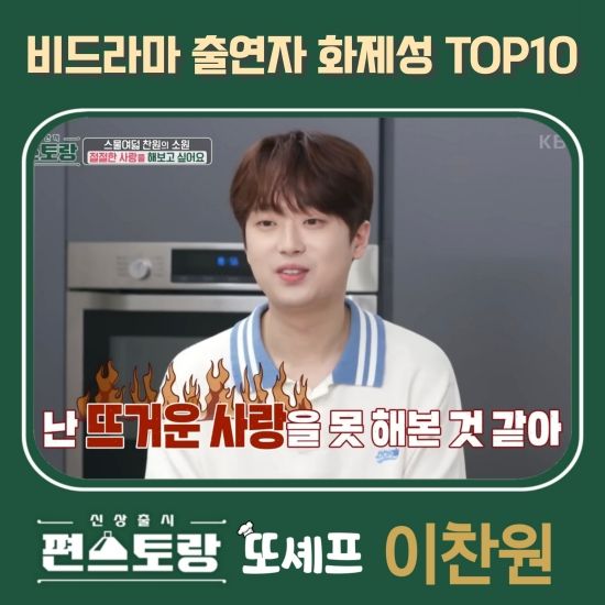 음식을 하던 중 이찬원은 '2024 파리올림픽' 당시 셀린 디옹이 열창한 '사랑의 찬가'를 흥얼거리다가 "이 노래를 떠올리면 울컥한다"라며 벅찬 모습을 보였다. 이어 "아직 뜨거운 사랑을 못 해봤다. 옆에 없으면 죽을 만큼 보고 싶고, 이별하면 집 앞에서 무릎을 꿇고 기다릴 정도의 열렬히 사모하는 사랑은 아직은 없었다"라고 고백했다.