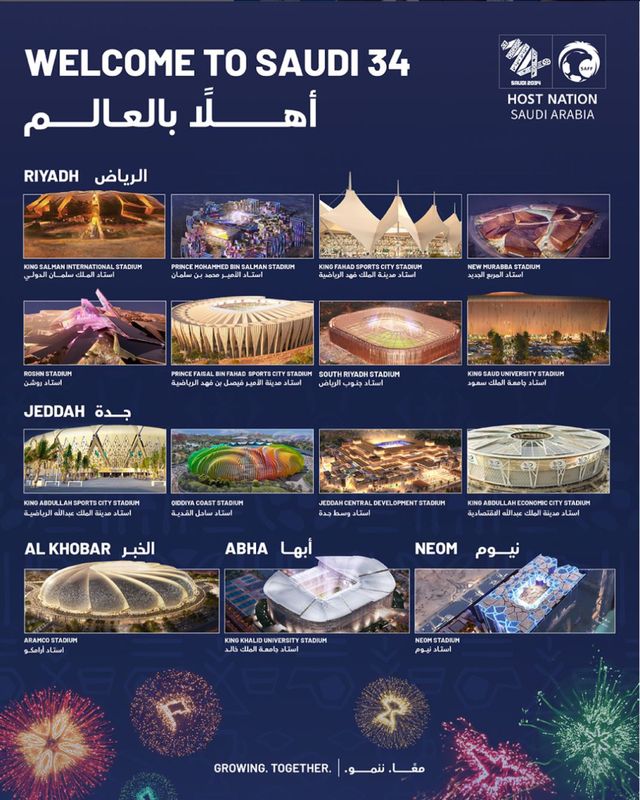 또한 FIFA 규정에 의하면 2034 월드컵을 개최하려면 최소 14개의 축구장이 필요하다. 특히 4만 명 이상을 수용할 수 있는 축구장 7개가 이미 있는 국가에만 자격이 주어진다. ‘화이트 엘리펀트(white elephant, 월드컵을 위해 막대한 비용이 투자된 축구장이 대회 후 쓸모가 없어진 경우)’가 생기는 것을 막기 위해서다. 하지만 FIFA는 슬쩍 이 기준을 7개에서 4개로 완화시켰다. 입찰 당시 사우디는 관중석 4만 개 이상의 축구장이 4개밖에 없었기 때문이다.