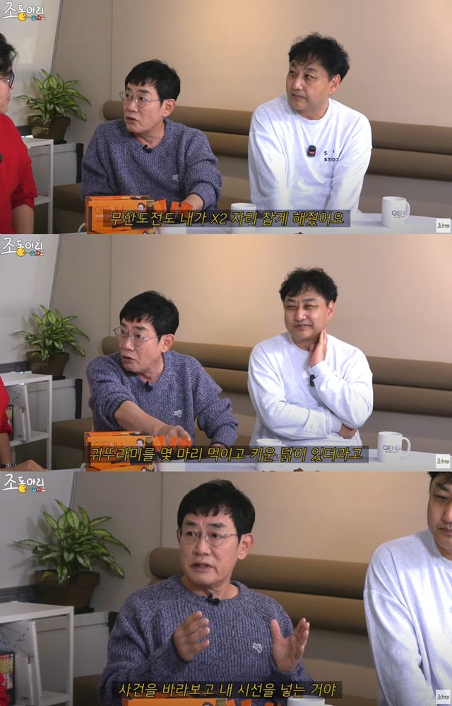 이날 이경규는 "재석이가 여기('조동아리') 나왔지?"라고 물으며 시작부터 쏘아붙였다. 지석진이 "나왔죠"라고 답하자, 그는 "진짜 실수했다. 내가 유재석이 하는 프로그램에 안 나간 적이 없다. '유퀴즈', '놀면 뭐하니', 심지어 '무한도전' 초창기에도 내가 나가서 자리 잡게 도와줬다"라며 자부심을 드러냈다.