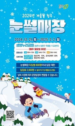 눈썰매장 예약은 주말 및 공휴일만 가능하며, 청주시청 홈페이지 팝업게시판과 홍보포스터 QR코드로 예약할 수 있다.