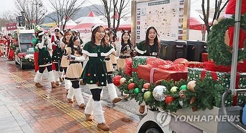 (임실=연합뉴스) 21일 전북 임실군 치즈테마파크에서 '2024 임실산타축제'가 개막한 가운데 관광객들이 산타퍼레이드를 즐기고 있다.