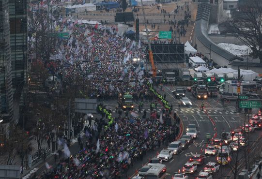 시민단체 퇴진비상행동은 이날 광화문 동십자각 앞에서 ‘윤석열 즉각 파면·처벌 사회대개혁 범국민 대행진’을 개최했다. 집회 측은 오후 5시 기준 30만명이 참석한 것으로 추산했다. 이는 14일 여의도 집회 추산 인원 200만명과 비교해 7분의 1 수준이다.