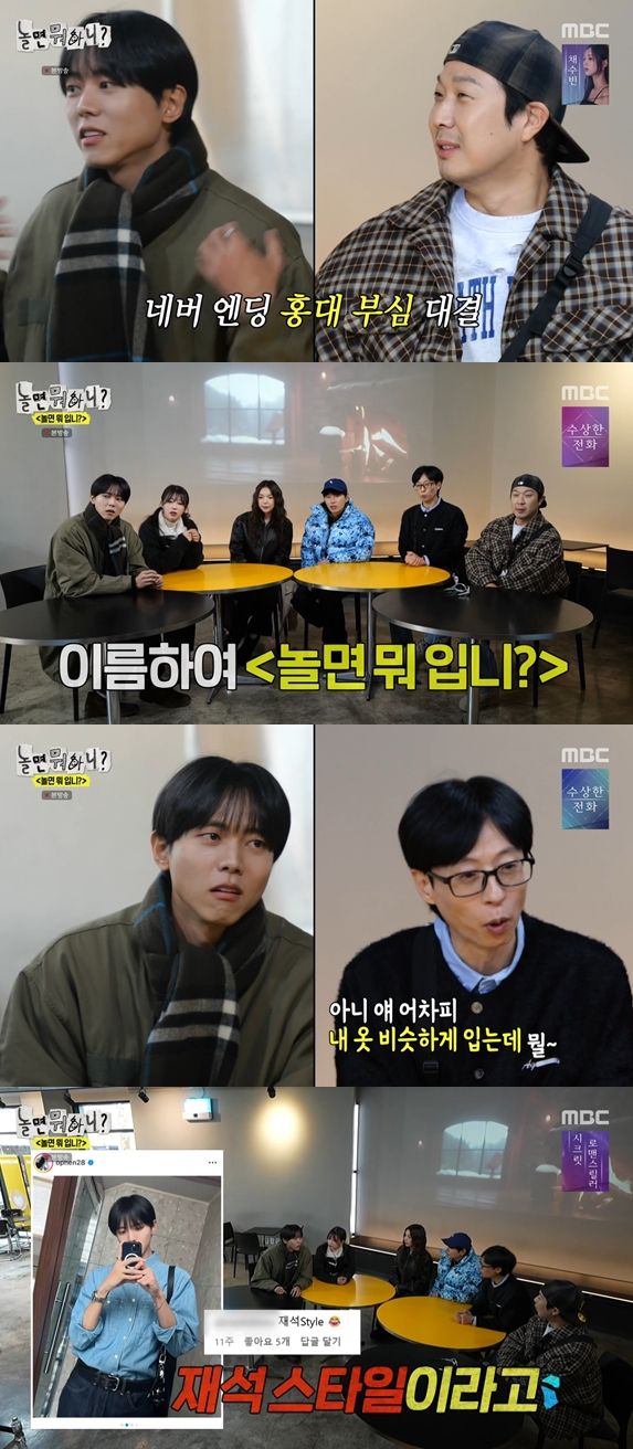 주우재는 "아직도 댓글이 달린다. 재석 스타일이라고"라며 열받아 했다. 유재석은 주우재가 입고 있는 옷을 보라며, "나하고 비슷하게 입는다"라고 강조했다.