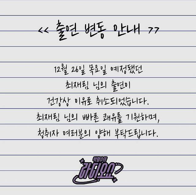 '라디오쇼' 측은 '출연 변동 안내'라는 제목으로 "12월 26일 목요일 예정됐던 최재림 님의 출연이 건강상 이유로 취소됐다"며 "최재림 님의 빠른 쾌유를 기원하며, 청취자 여러분의 양해 부탁드린다'라고 밝혔다.