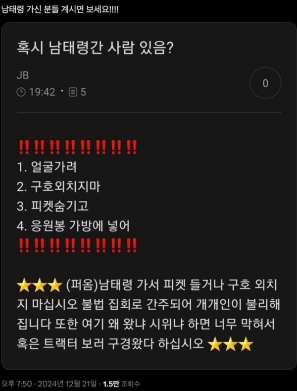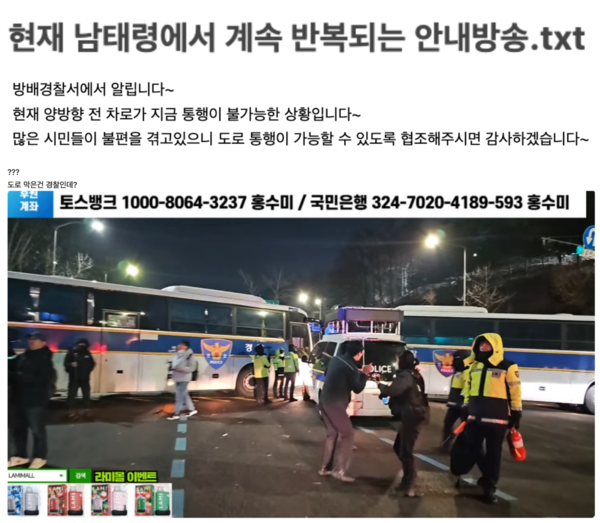 이어 "대치가 이어지고 있지만 무력 충돌은 없는 상태다. 경찰이 계속 막는다면 남태령에서 농성을 이어갈 가능성이 크다"고 덧붙였다.