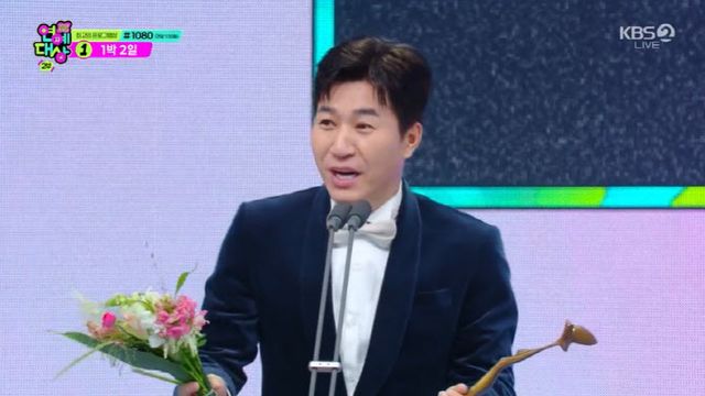 21일 오후 서울 영등포구 여의도동 KBS 신관 공개홀에서 진행된 ‘2024 KBS 연예대상’에서 전현무, 김종민은 시청자가 뽑은 최우수 프로그램상 시상을 위해 무대에 올랐다.