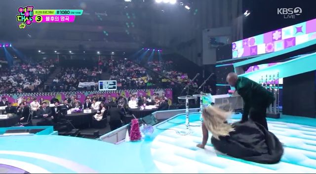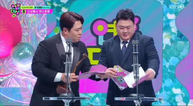 당황한 김준현, 문세윤은 시상자 자리로 돌아가 봉투를 확인했지만 또다른 수상자는 적혀 있지 않았다. 이들은 "이 봉투에는 있지 않다. 저희는 그 봉투를 받지 않았다"고 얘기했다. 결국 프롬프터의 도움을 받아 또다른 수상자 '더 시즌즈' 이영지를 호명할 수 있었다.