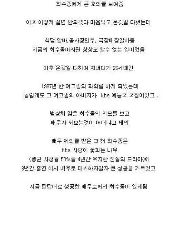 집안이 망하고 서울역에서 노숙하던 최수종이 일을 시작하게된 이유.