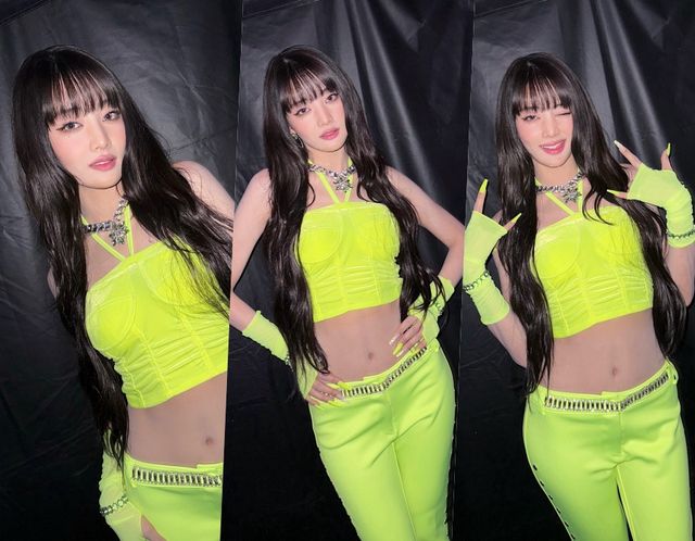 사진 속 민니는 무대 백스테이지에서 다양한 포즈를 취하고 있다. 특히 소화가 어려운 형광색 의상마저도 완벽히 소화해 감탄을 자아냈다.