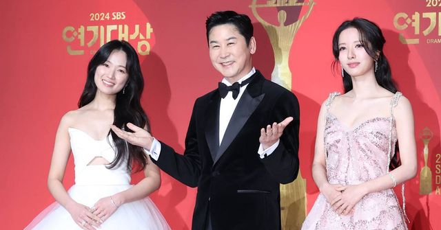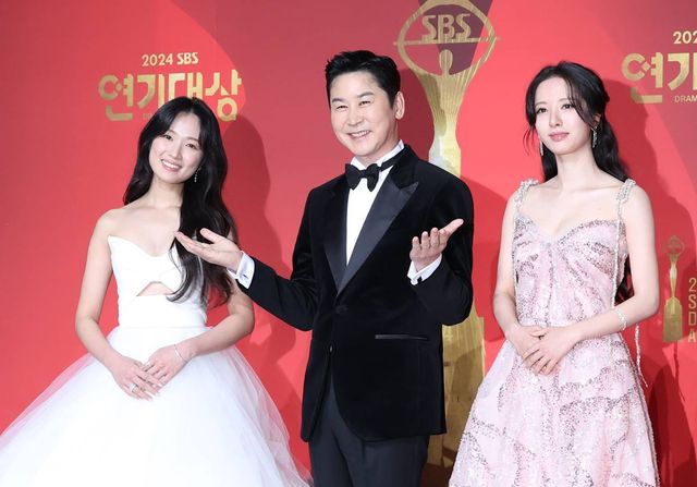 MC 김혜윤(왼쪽부터), 신동엽, 김지연이 지난 21일 오후 서울 마포구 상암동 SBS 프리즘타워에서 열린 '2024 SBS 연기대상' 레드카펫 행사에 참석해 포즈를 취하고 있다 / 뉴스1