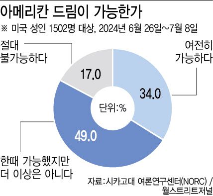 다른 조사에서도 미국인들의 반응은 비슷했다. 시카고대 여론연구센터(NORC)가 지난 6~7월 미국 성인 1502명을 대상으로 아메리칸 드림 관련 인식 조사를 한 결과 ‘아메리칸 드림이 여전히 유효하다’고 답한 비율은 34%로 조사 대상의 3분의 1에 그쳤다. 이는 미국 공공종교연구소(PRRI)가 지난 2012년 성인 2501명을 대상으로 설문조사를 했을 당시 ‘아메리칸 드림이 여전히 유효하다’는 응답이 53%를 기록, 절반을 넘었던 것과 비교하면 큰 차이를 보인다.