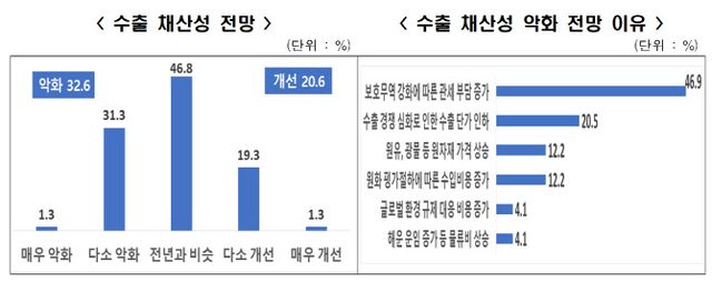 응답 기업의 32.6%는 내년 수출 채산성이 올해보다 악화할 것이라고 내다봤다. 채산성 개선을 전망하는 기업(20.6%)보다 많았다. 채산성 악화 전망이 많은 업종은 선박(50.0%), 전기전자(45.4%), 자동차·부품(42.9%) 등 순으로 조사됐다.
