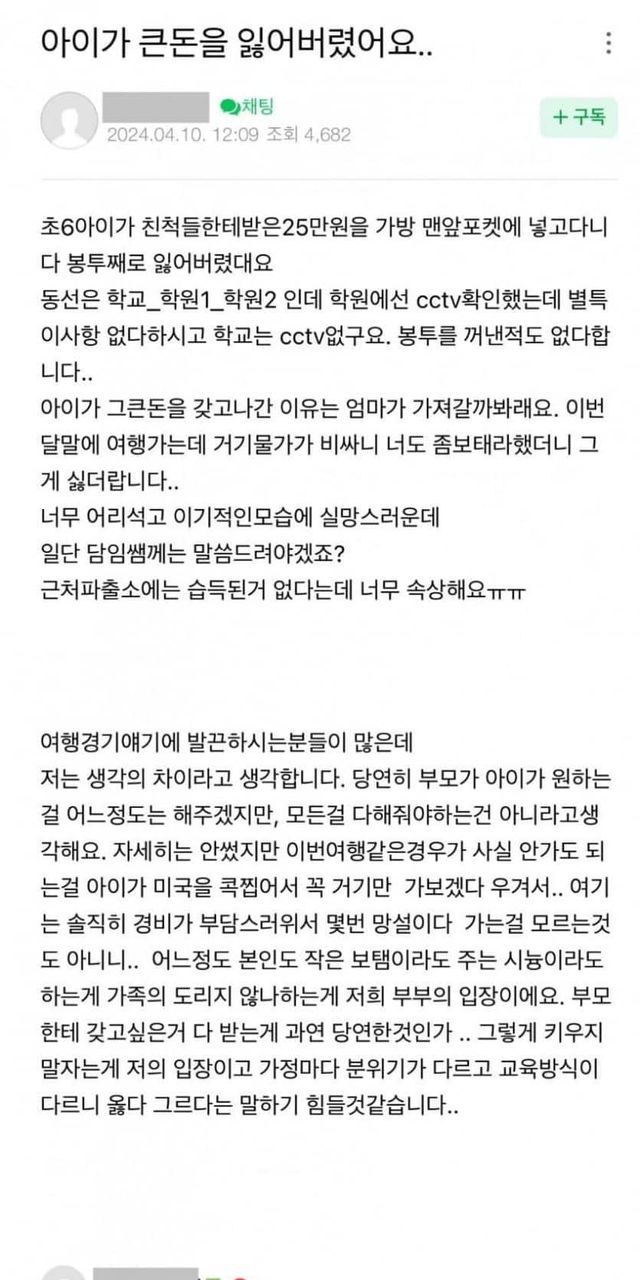 아이가 큰돈을 잃어버렸어요