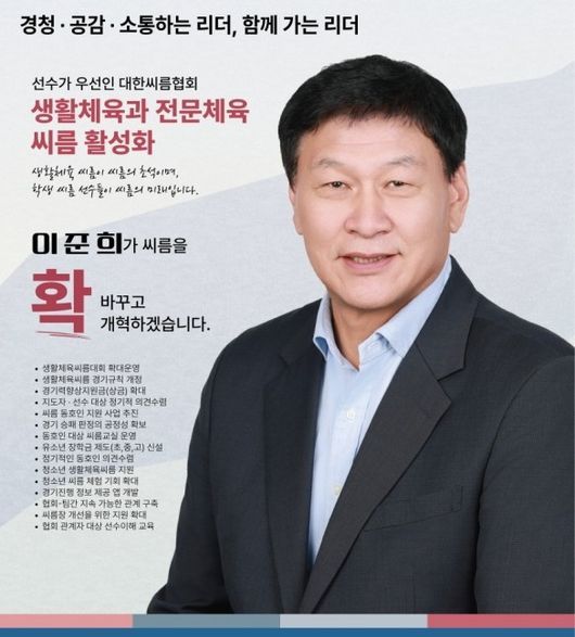 이 신임회장은 당선 인사말을 통해 "씨름인들이 압도적으로 지지를 보내주신데 대해 그저 감사하다"며 "그만큼 씨름 개혁에 대한 열망이 크다는 것을 잘 알고 있다. 기대에 부응하기 위해 온 힘을 다하겠다"고 말했다.