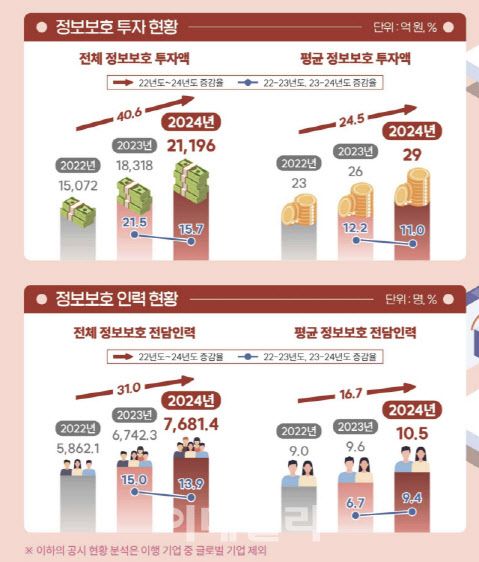 다만 전체적인 투자액과 인력 증가에도 불구하고 전체 정보기술 투자 대비 정보보호에 사용한 돈은 큰 변화가 없었다. 삼성전자의 경우 작년 정보보호 투자비중이 5.55%에서 올해는 4.9%로 감소했다. 쿠팡은 6.88%에서 5.6%로 줄었다. 개인정보보호가 중요한 정보통신업을 하는 KT의 경우는 작년 5.41%에서 6.4%로 약 1%p 증가했다. 한국 기업의 정보보호 투자액 비중은 대부분 10%를 밑도는 수준으로, 미국(26%)·독일(24%)·영국(23%) 등의 절반에도 못미친다는 지적이다.
