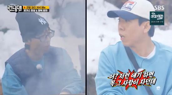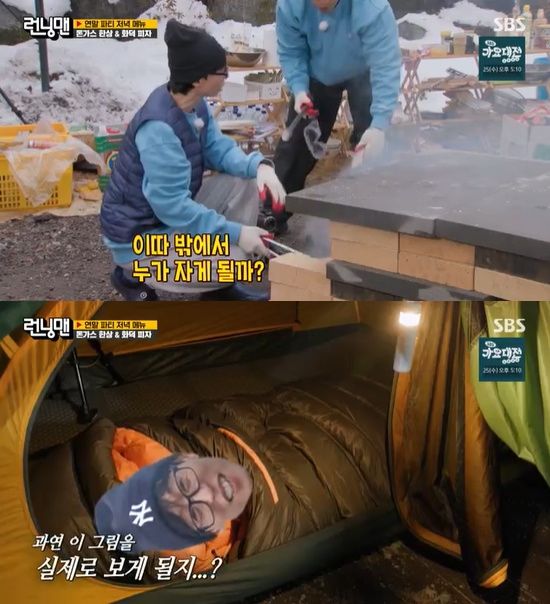 이날 '런닝맨' 멤버들은 팀을 나눠 연말 파티에서 먹을 돈가스와 화덕 피자 제작에 돌입했다. 한창 요리에 몰두하던 도중, 유재석은 "야 근데 이렇게 너무 좋은데 이따 밖에서 누가 자게 될까?"라며 강원도 비박 멤버를 추측했다.