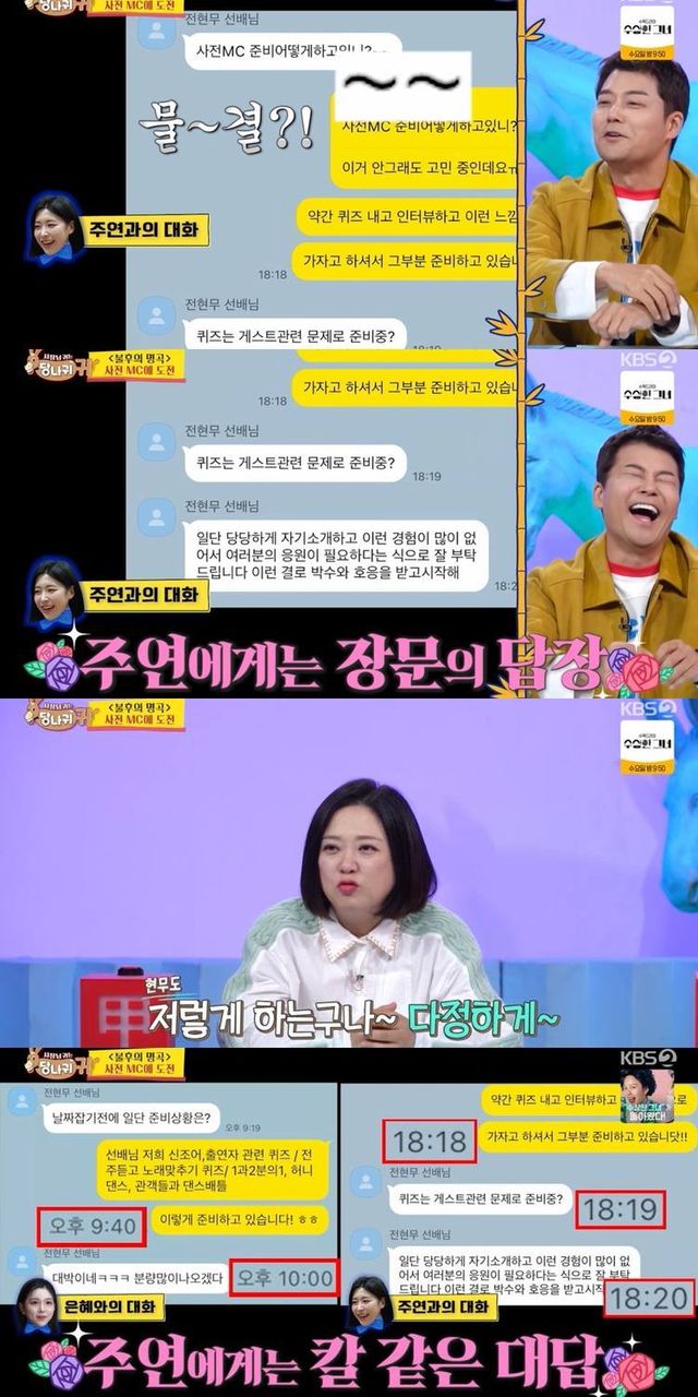 김숙은 “저렇게 답장을 길게 하는 사람이 아니다”라며 지적했고, 전현무는 “우리는 대면으로 자주 보잖아”라면서 “주연이랑은 비교적 여유로운 오후 6시고, 주연이는 이보다 늦은 오후 10시에 연락해서 그렇다”며 수습했다.