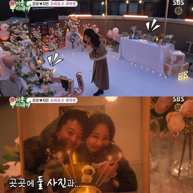 메인 이벤트는 옥상. 이곳에는 김준호가 직접 준비한 노래부터 영상 편지 등이 준비돼 있었다. 또 곳곳에는 두 사람의 연애 시절 사진과 꽃이 놓여 있어 감동을 배가시켰다. 영상 편지를 보던 김지민은 눈물을 흘렸고, 이를 뒤에서 지켜보던 김준호, 이상민 역시 숨죽여 울었다.