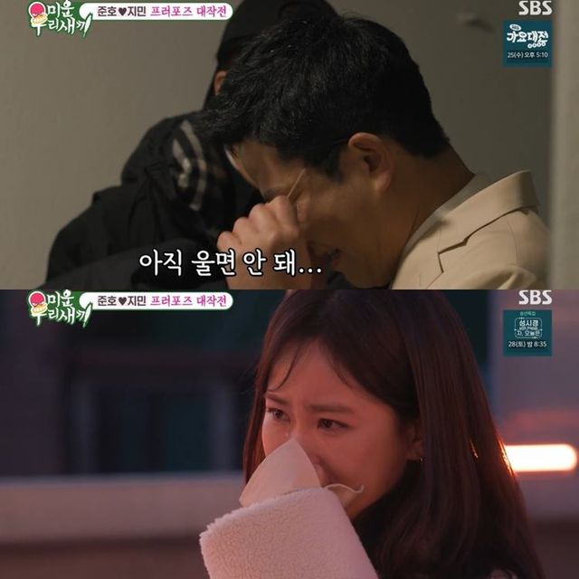 꽉 껴안은 두 사람은 백년가약을 약속했고, 이를 스튜디오에서 지켜보던 MC 및 패널들도 눈물을 흘렸다. 특히 신동엽은 “예전에 지민이 아버지가 돌아가셨을 때 생각난다. 준호가 끝까지 빈소를 지키는 모습이 참 듬직했다”며 두 사람의 사랑을 응원했다.