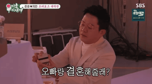 그런가 하면 이날 김준호는 김지민에게 프러포즈를 하기도 했다. 김준호는 미리 준비한 프러포즈 영상을 틀었고, 김지민은 눈물을 흘렸다. 영상이 끝나자, 김준호는 "진짜 모자란 오빠를 사랑해줘서 고맙고 앞으로 아프지 말고 우리 오랫동안 사랑하자. 오빠랑 결혼해줄래?"라고 청혼했다.