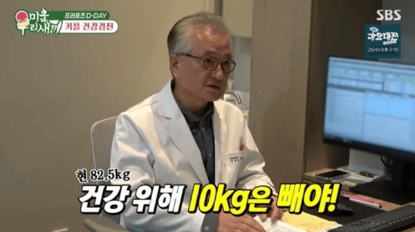 반면 김준호는 170.4cm에 82.5kg으로 과체중이었다. 그의 체지방률은 정상인의 2배였다. 의사는 "비만증에 가까운 수치다. 여기사 10kg은 뺴야 한다. 콜레스테롤과 중성지방이 높다. 둘 다 200이 넘으면 안 되는데 콜레스테롤 222, 중성지방 285다. 중성지방은 술과 직접적인 관계가 있다"라고 경고했다.