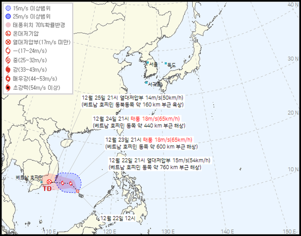 (서울/국제뉴스) 민소미 기자 = 기상청은 "22일 21시 경 베트남 호찌민 동쪽 약 760km 부근 해상에서 발생한 56호 열대저압부는 24시간 이내 제26호 태풍 파북(PABUK)으로 발달될 것"이라고 전했다.
