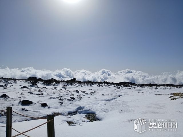 그렇게 한참을 조심해서 올라갔을까? 실성한 사람처럼 웃으며 철민이에게 이건 그냥 리얼 등산 아니냐? 탐방로라며? 지금 돌이켜봐도 웃음이 절로 나온다. 우리는 분명 탐방로를 찾아갔지만 어쩌다가 고난도 등산을 해버렸다. 점점 말수가 사라졌다. 윤종신이 작곡한 <오르막길>이 귀에서 자동 재생되었다. 이제부터 웃음기 사라질 거야. 웃음기는 진작 사라졌다. 웃음기는 없어졌지만 그 빈자리를 황홀한 감정이 가득 채웠다. 어느정도 올라가니 드넓은 설원이 보였는데 주변을 둘러보니 어느덧 구름 위에 위치해 있었다. 마치 천국에 올라온 기분이었다. 시선 아래 구름들을 보아하니 뭔가 형용할 수 없는 감정들이 밀려왔다. 대자연 앞에서 그동안 품어왔던 상념과 고민거리들이 부질없게 느껴졌다. 이래서 사람들이 산을 오르는가 싶었다. 언제 이렇게 구름 위로 올라가 보겠는가? 큰 깨달음과는 별개로 힘듦은 여전했다. 좋은 경치고 나발이고 힘든 건 힘든 거다. 난 T다. 하지만 그럴 때마다 경치 뽕으로 꾸역꾸역 힘을 내며 올라갈 수 있었다. 가끔 마주치는 중년 등산객들은 “아이고 장비도 안 차고 올라왓어? 등산화라도 신고 오지”라며 걱정을 했는데 다음에는 꼭 장비와 복장을 갖추고 와야 겠다.