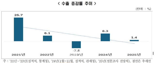 22일 한국경제인협회(한경협)·한국무역협회가 각각 발표한 내년 전체 및 내년 초 수출·산업 전망 보고서에 따르면 한국 수출은 기대보다 우려가 큰 것으로 나타났다. 한경협이 시장조사 전문기관인 모노리서치에 의뢰해 매출액 1000대 기업 중 12대 수출 주력업종을 대상으로 ‘2025년 수출 전망 조사’를 진행한 결과, 응답 기업들은 2025년 수출이 올해 대비 1.4% 증가에 그칠 것으로 진단했다.