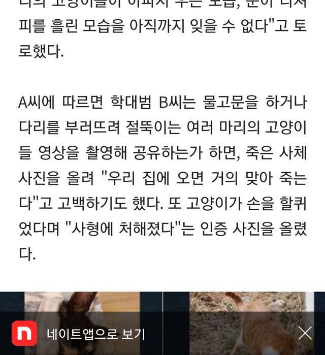 앞서 A씨는 지난달 22일엔 포항시 구룡포의 한 폐양식장에서 고양이 여러 마리를 잔혹하게 학대하고 죽인 20대 남성과 접촉한 적이 있다. 당시 범인이 느꼈던 ‘분노’라는 감정을 B씨에게서는 전혀 찾아볼 수 없었다고 A씨는 말한다.