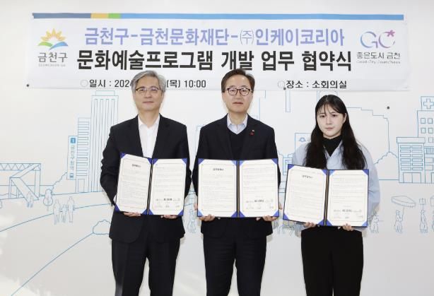 [파이낸셜경제=김영란 기자] 금천구는 12월 19일 금천구청 9층 소회의실에서 ㈜인케이코리아, 금천문화재단과 지밸리(G밸리) 내 문화프로그램 개발을 위한 업무협약’을 체결했다고 밝혔다.