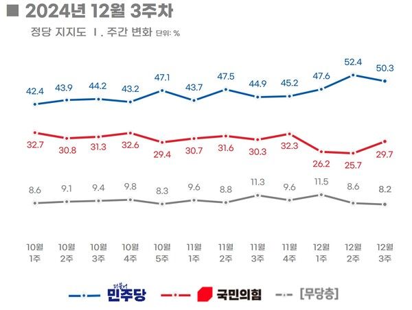 [폴리뉴스 김승훈 기자] 윤석열 대통령의 탄핵정국이 이어지고 있는 가운데 국민의힘 정당 지지율이 상승하고 민주당은 하락하면서 양당 격차가 줄어들었다.
