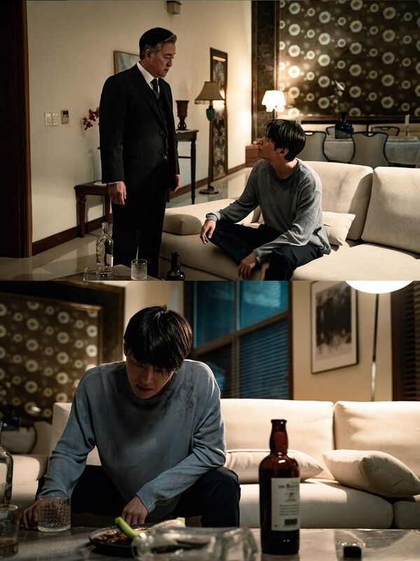 사진 속 지명섭 앞에 위치한 테이블 위에는 빈 술병이 여럿 놓여 있어 그가 유치장을 나온 이후로도 정신 못 차리고 술만 마셨다는 걸 보여준다. 지동만은 그런 지명섭을 한심한 눈으로 바라보고, 지명섭 역시 지지 않고 원망 어린 눈빛으로 아버지를 쳐다본다. 과연 이들 부자 사이에 어떤 일이 벌어진 것인지, 그리고 오정그룹의 운명은 어떻게 될 것인지 호기심을 자극한다.
