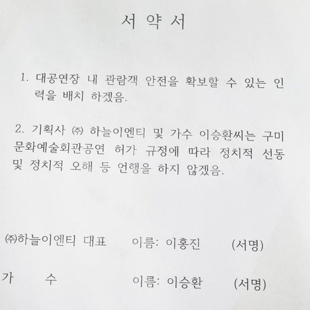 특히 이승환은 구미시 측의 '안전을 위한 결정'이라는 말에 동의할 수 없다며, 이들이 공연을 취소한 진짜 이유가 '서약서 날인 거부'에 있다고 주장했다. 이승환은 "회관은 지난 20일 공연 기획사에 공문을 보내 기획사 대표와 가수 이승환에게 '구미문화예술회관공연 허가 규정에 따라 정치적 선동 및 정치적 오해 등 언행을 하지 않겠음'이라는 서약서에 날인할 것을 요구했고, '미 이행시 취소할 수 있음'을 언급했다"라며 "대관규정 및 사용허가 내용에 전혀 존재하지 않는 서약서 작성 요구를, 그것도 계약 당사자도 아닌 출연자의 서약까지 포함해 대관일자가 임박한 시점에 심지어 일요일 특정 시간(12월 22일 오후 2시)까지 제출하라고 부당한 요구를 했다. 이에 저는 법무법인을 통해 서명 의사가 없다는 점을 밝혔다"라고 설명했다.