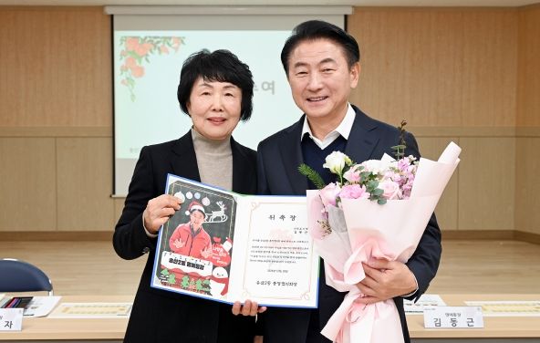 | ▲ 김동근 시장이 12월 20일 송산2동 일일 명예통장으로 위촉된 뒤 강경자 송산2동 통장협의회장과 기념사진을 찍고 있다. |