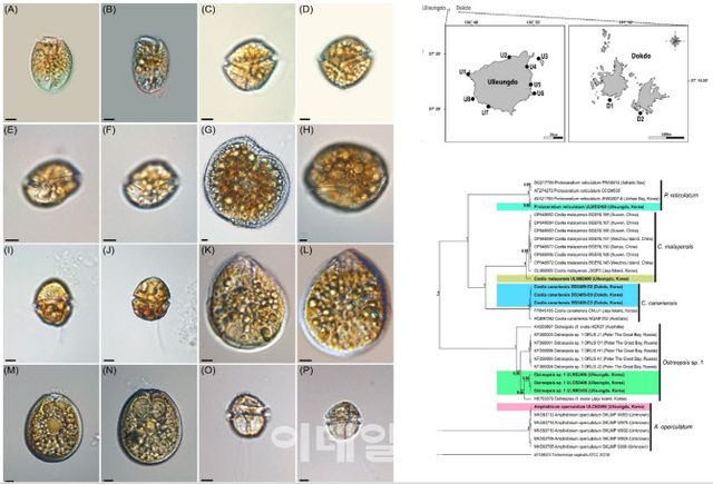 울릉도에서는 오스트레옵시스(Ostreopsis), 쿨리아 말레이엔시스(Coolia malayensis), 프로토세라티움(Protoceratium) 등을 독도에서는 쿨리아 카나리엔시스(Coolia canariensis)와 갬비어디스커스(Gambierdiscus)가 발견됐다.