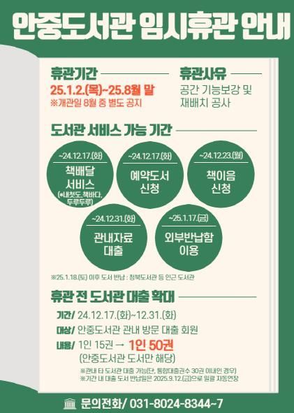 이에 따라 안중도서관은 휴관에 따른 시민의 불편 최소화를 위해 12월 17일(화)부터 휴관 전까지 대출 확대 서비스(1인 15권 → 50권)를 시행하고 있으며 2025년 1월부터 예약 대출 서비스(1인 5권, 상호대차 가능), 온라인 정보제공, 비대면 인문학 강의 등을 진행할 예정이니 도서관 누리집을 참고하면 된다.